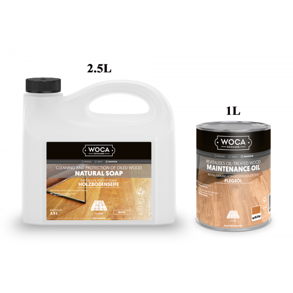 DC129, Essential care kit, Clean white classic-oiled floors inc. Woca white versions of soap and maintenance oil