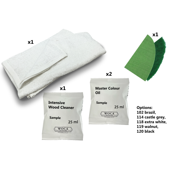 DC083, DC084, DC086, DC087 Samples kits. Woca Master Colour Oils, kit, Group One & two (102 brazil, 114 castle grey, 118 extra white, 119 walnut, 120 black) (DC)