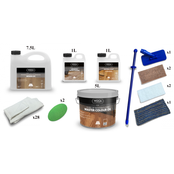Kit Saving: DC006 (d) Woca Wood Lye white and Woca Master Colour Oil 118 Extra White floor, 36 to 55m2, Work by hand (DC)